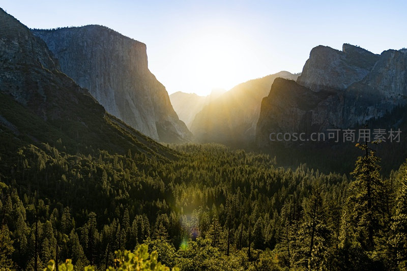 优胜美地山谷晨曦穿透花岗岩峭壁森林