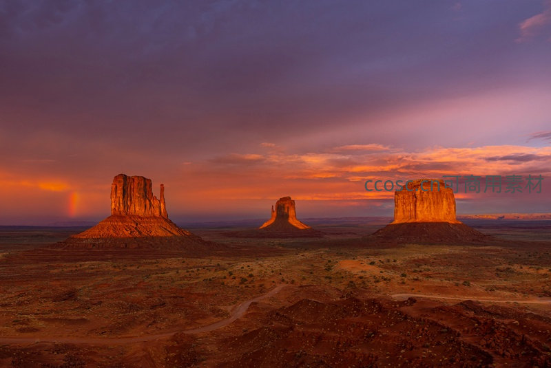 夕阳为纪念碑谷三座标志性砂岩柱披上金红光辉,左侧隐约可见彩虹弧线,广袤荒漠延伸至天际,呈现美国西南部独特地质奇观。