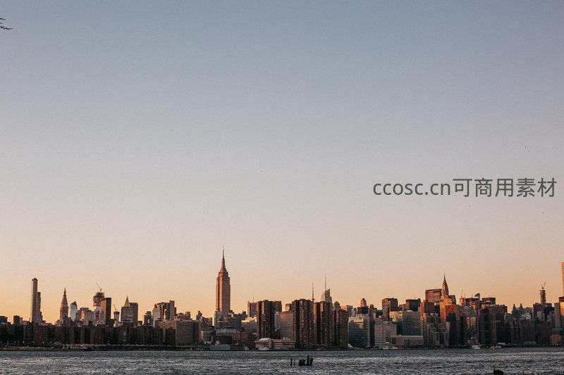 纽约曼哈顿天际线日落剪影,帝国大厦居中闪耀