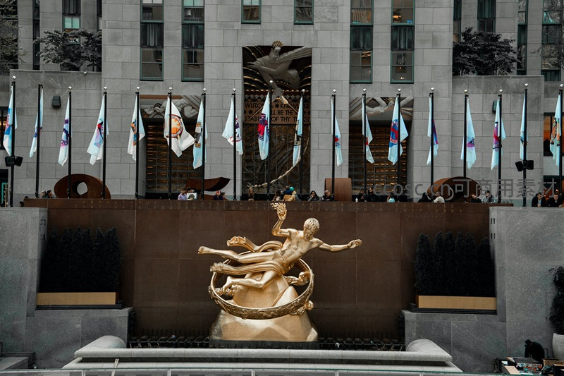 青铜镀金的普罗米修斯雕像在灰调石材基座上熠熠生辉,象征知识与光明;背景巨幅浮雕与林立旗杆形成庄重仪式感,游客三五成群拍照休憩,冬日阳光斜照其上,彰显纽约作为世界文化交汇点的独特气质。