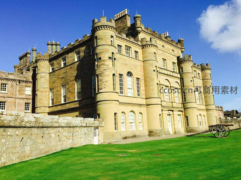 晴朗蓝天下,克雷格米勒城堡以暖黄色砂岩墙体与圆柱形塔楼展现19世纪哥特复兴风格;前方修剪整齐的翠绿草坪上陈列古炮,石墙斑驳质感与明媚光影交织,彰显苏格兰贵族庄园的历史厚重与庄严气派。