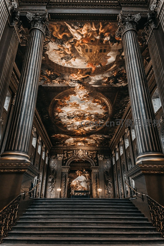 宏伟阶梯通向装饰繁复的宫殿大厅,两侧科林斯柱支撑高耸空间;天花板布满动态十足的湿壁画,天使、神祇与云朵交织成戏剧性场景,金箔细节在幽暗光线下熠熠生辉,彰显18世纪欧洲宫廷艺术的极致奢华与宗教象征意义。