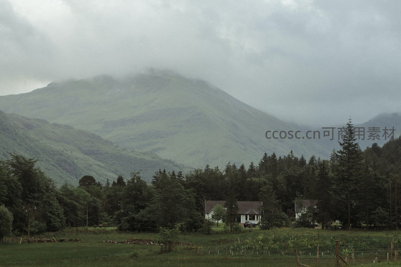 云雾缭绕的苏格兰山谷农舍,绿意盎然的山坡与松林环绕