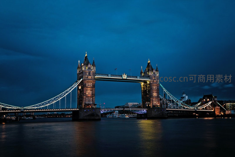 夜幕下的伦敦塔桥灯火辉煌,倒影摇曳于泰晤士河面,经典英伦夜景