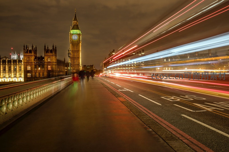 大本钟夜色璀璨,威斯敏斯特桥车流光轨如彩带飞舞,都市脉动尽显