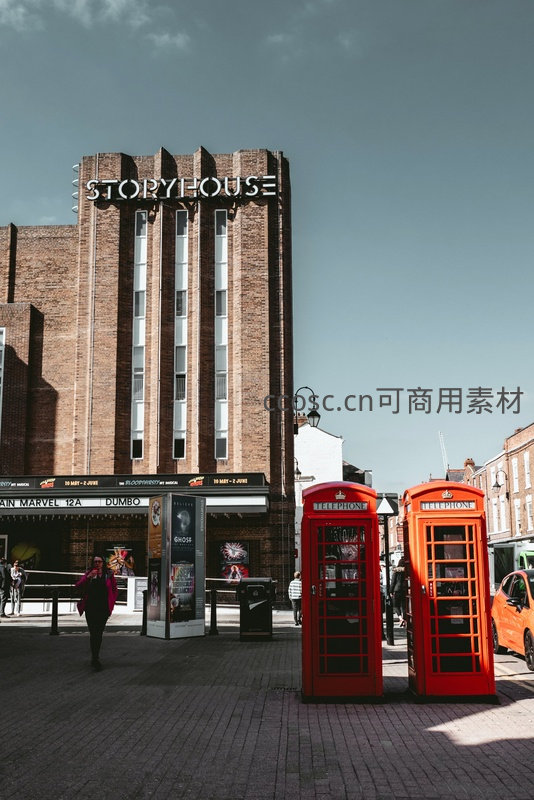 明媚日光下,两座标志性的鲜红K6电话亭并排伫立于Storyhouse剧院前广场,砖砌艺术装饰风格建筑醒目,行人穿行其间,橙色汽车停靠路边,生动再现伦敦街头兼具历史符号与日常活力的城市人文场景。