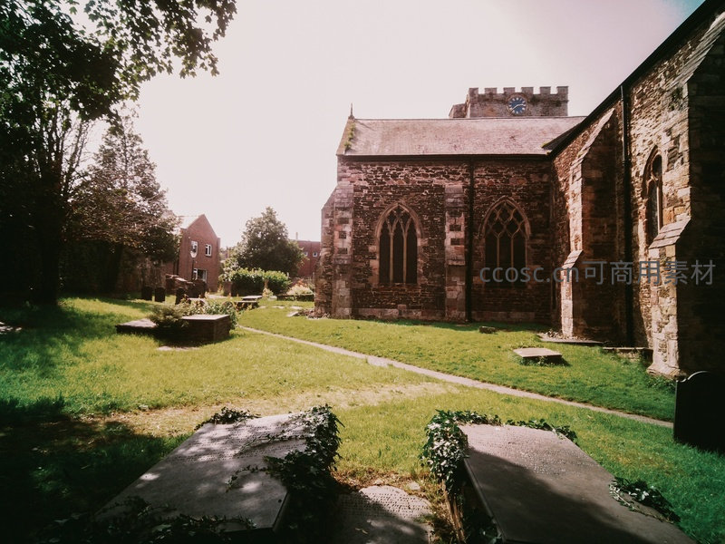 红砂岩砌筑的中世纪教堂侧翼沐浴在柔和日光中,尖拱窗与钟楼清晰可见;前方草坪小径蜿蜒,几块覆满常春藤的墓碑静卧其中,背景隐约可见民居,营造出庄重而平和的历史氛围。