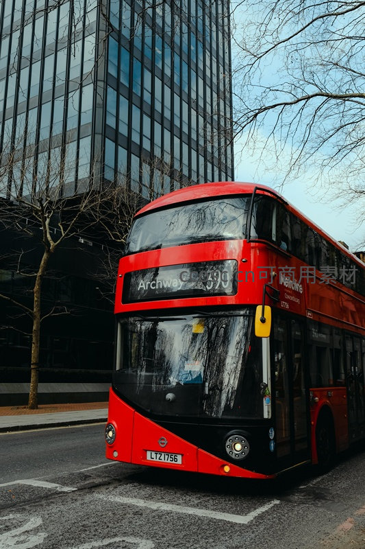 一辆编号390开往Archway的新型红色双层巴士停靠在现代化玻璃幕墙办公楼前,光秃树枝映衬蓝天,地面标线清晰,体现伦敦公共交通与当代商业区的和谐共存。