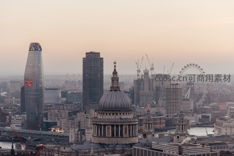 日出时分伦敦全景,圣保罗大教堂穹顶居中,碎片大厦与伦敦眼映衬