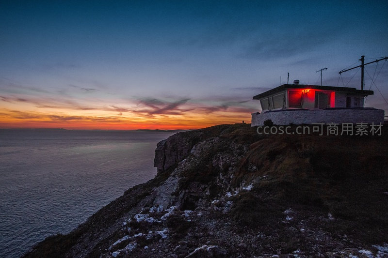 悬崖灯塔日落时分,红光映照海天交界处