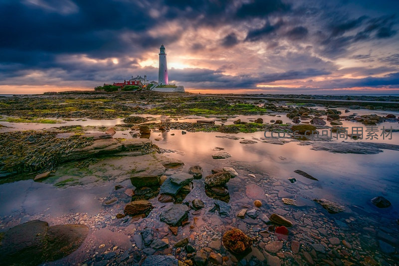 黄昏时分,白色灯塔与红顶建筑静立于潮间带礁石之上,厚重云层被夕阳染成紫橙渐变,水面倒映光影,前景湿滑岩滩布满海藻与水洼,营造出宁静而壮丽的滨海景象。