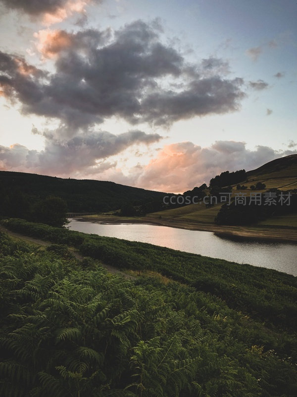 山谷水库暮色温柔,蕨类丛生坡岸映衬粉紫云霞