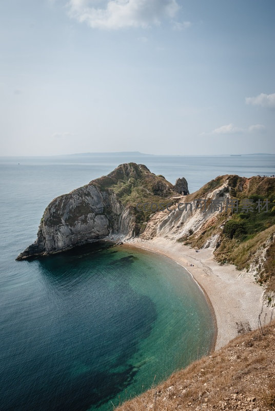 从高处俯瞰英格兰南部著名多佛白崖,纯白 chalk 岩壁与翠绿植被交错,环抱清澈碧蓝海湾与细软沙滩;远处海天一色,凸显地质演变与海洋侵蚀的壮丽杰作。