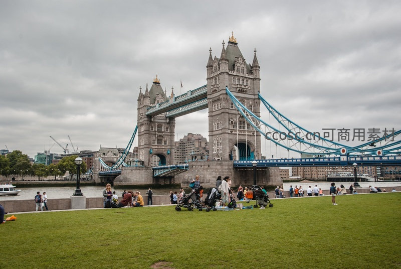 阴天下的伦敦塔桥近景,河岸绿茵草坪上散布着野餐家庭与游客,婴儿车、背包与笑声交织;背景中塔桥巍峨静默,呈现都市中难得的慢节奏人文生活图景。