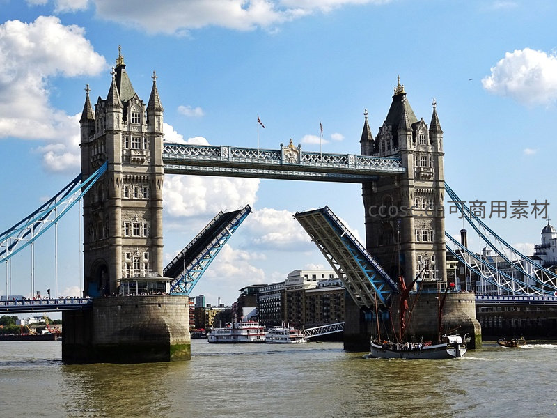 塔桥开启瞬间:双叶桥面高高扬起,船只从容穿行泰晤士河