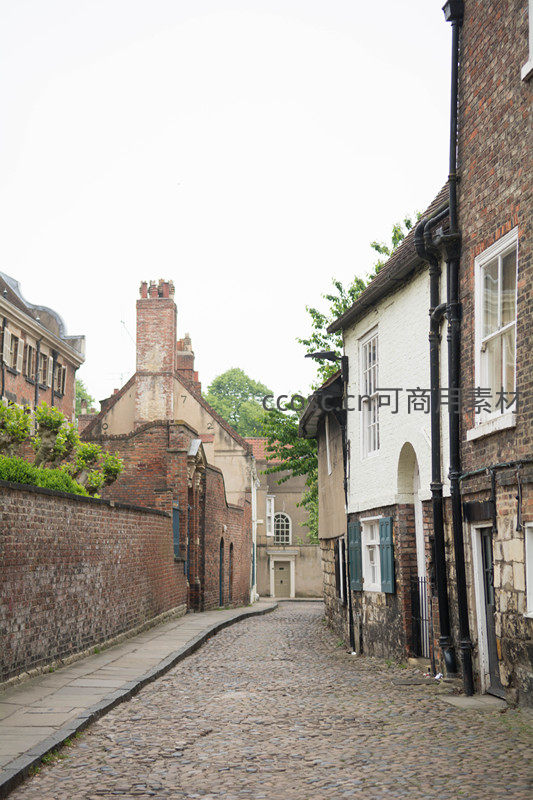 蜿蜒鹅卵石小巷,白墙黑管老屋与红砖墙交织的中世纪风貌
