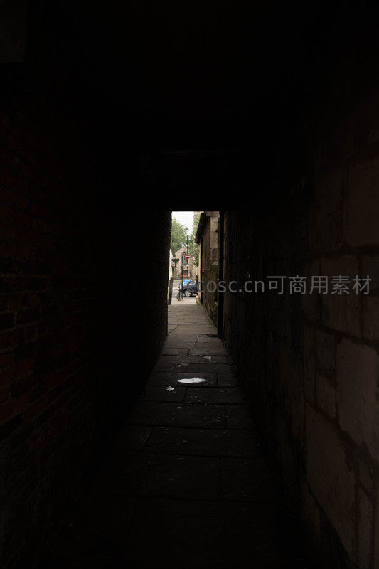 幽暗拱廊通道尽头透光,石墙缝隙间窥见街市一角