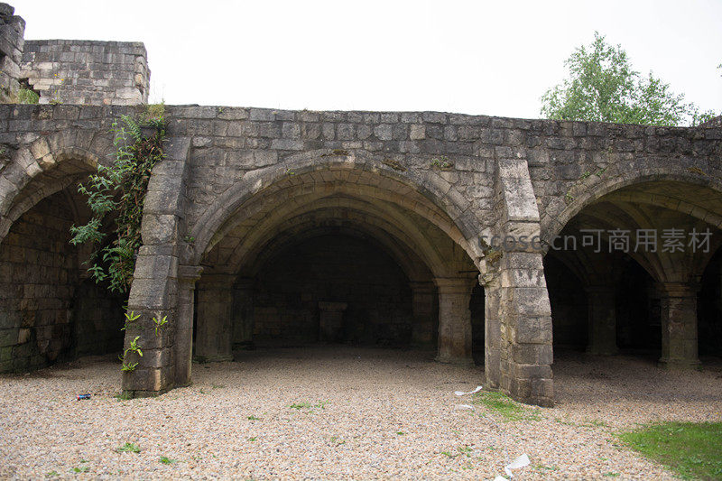 一座保存完好的中世纪石砌拱廊遗迹,粗犷石柱支撑连续尖券拱顶,部分墙体覆有绿植青苔;地面铺满碎石与零星杂草,光影交错营造出沧桑静谧氛围,体现欧洲修道院或城堡附属建筑的典型特征。
