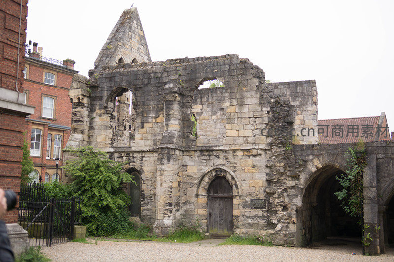 约克圣玛丽修道院遗址的残存石墙,历经风雨侵蚀仍显庄严,尖顶塔楼、拱形窗洞与木质门扉保存部分原貌,墙缝间生长着茂盛绿植,展现自然与人文遗存的和谐共生。