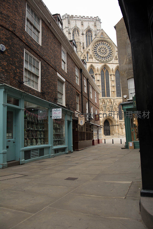 窄巷尽头矗立约克大教堂哥特式玫瑰窗立面