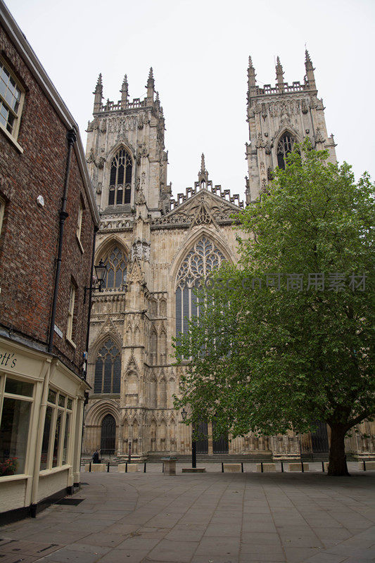 约克大教堂标志性的双塔在灰白天空下巍然耸立,前景一棵茂盛绿树柔化硬朗线条,左侧砖砌商铺与路灯构成日常街景层次,整体画面融合神圣庄严与生活气息,展现古城和谐共生之美。