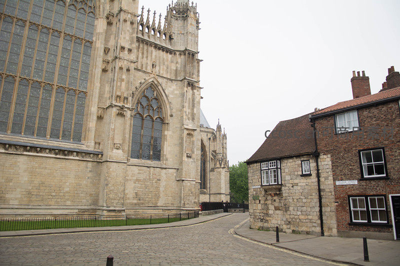 约克大教堂侧面全景与邻近砖石民居对比