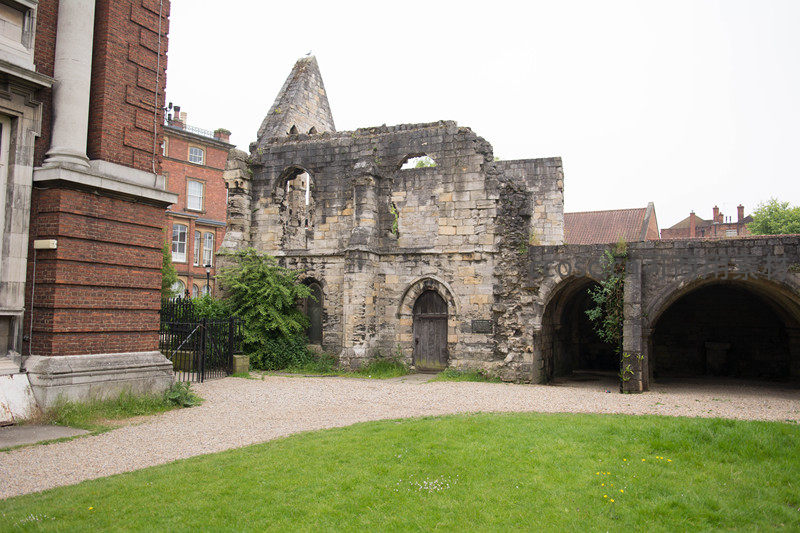修道院废墟与现代红砖建筑并置,尖顶残垣与规整窗格形成时空对话