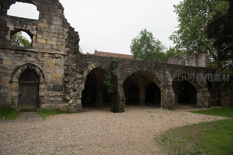 约克圣玛丽修道院(St Mary's Abbey)遗址的石砌拱廊群,历经数百年风雨侵蚀,部分墙体坍塌,绿植悄然生长于缝隙间;碎石地面与斑驳石柱在阴天柔光下更显沧桑,诉说着宗教与时间的故事。