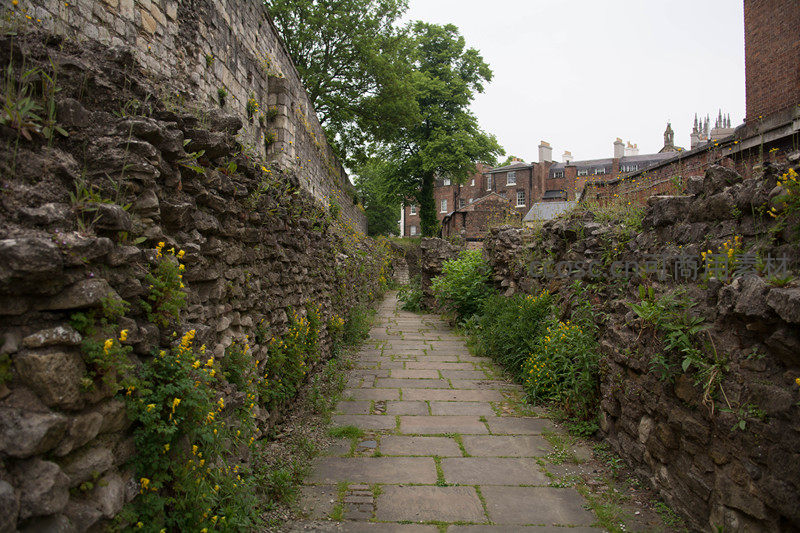 古老石墙夹道小径,野花丛生绿意盎然,城市遗迹与自然共生