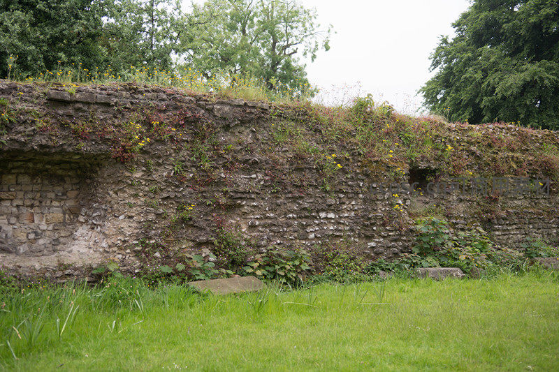 长段古罗马城墙遗存,青苔覆顶野草蔓延,绿茵前显沧桑岁月痕迹