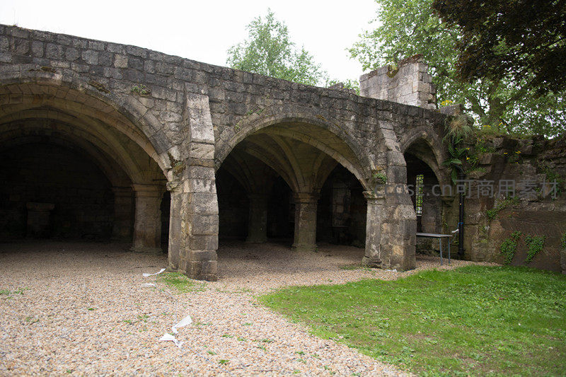 约克圣玛丽修道院残存的哥特式石拱回廊,粗粝砂岩柱墩支撑连续尖券,地面铺满碎石与零星纸屑;右侧绿草茵茵,藤蔓攀爬断壁,背景树影婆娑,展现时间侵蚀下建筑与自然和谐共存的沧桑美感。