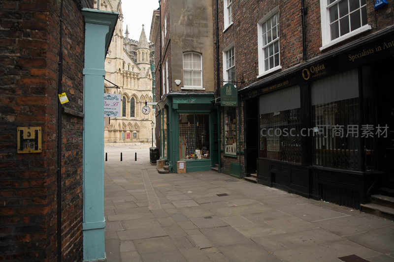 巷道视角下的约克大教堂:青绿色门框与古店招牌构成画框