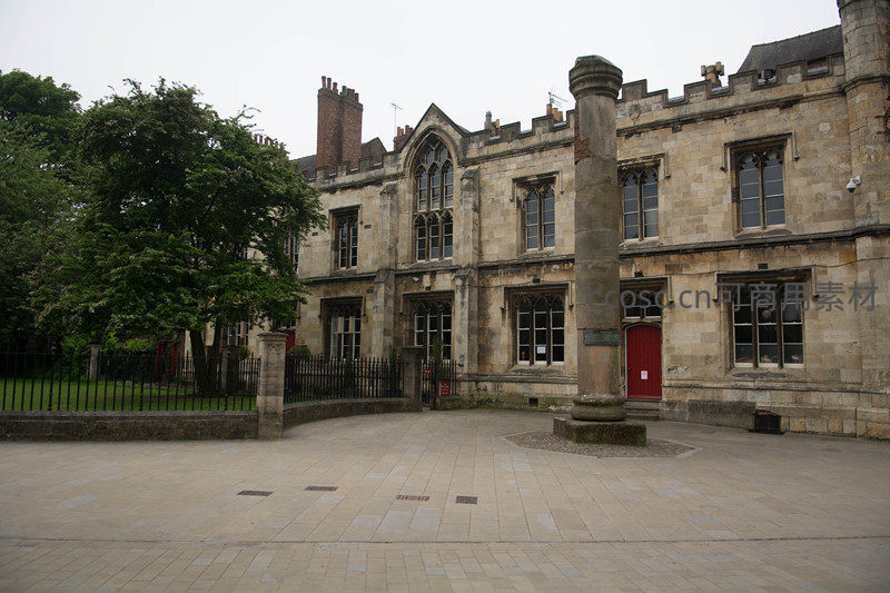 圣威廉学院外广场:古朴砂岩建筑群与独立石柱的对称构图