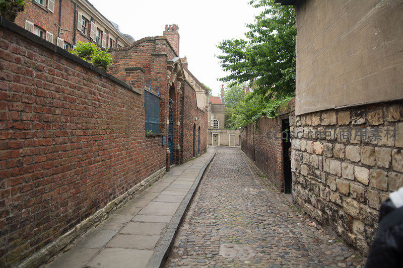 狭窄鹅卵石巷道两侧红砖墙与石墙交错,绿树掩映幽深小径