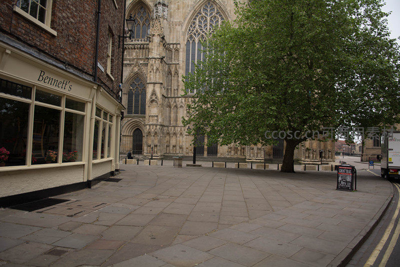 约克大教堂前街景,绿树掩映古建筑与商铺招牌