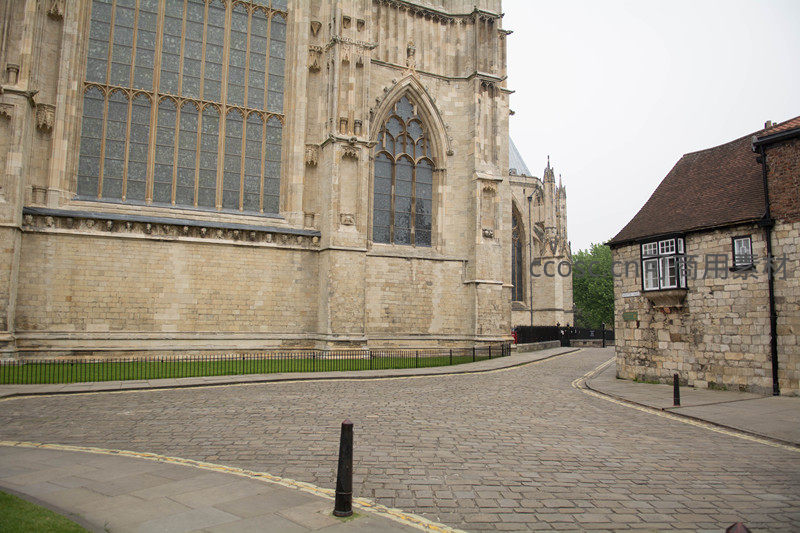 约克大教堂高耸石墙与毗邻的14世纪石屋形成时代对话,教堂巨大窗棂透出幽光,老屋白窗黑瓦质朴厚重;前景鹅卵石路蜿蜒,黄线标示边界,绿植点缀其间,呈现历史层叠的城市肌理。