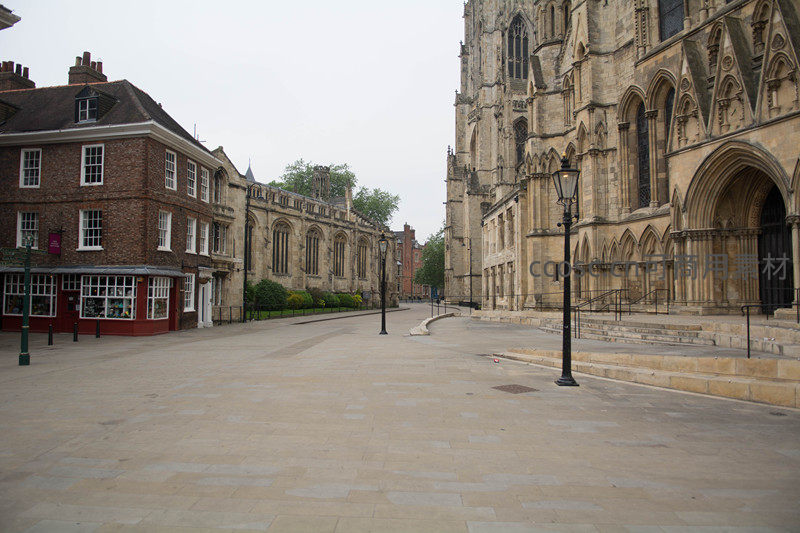 空旷广场前矗立约克大教堂西立面,哥特雕饰精美,旁侧红砖商铺静默守候