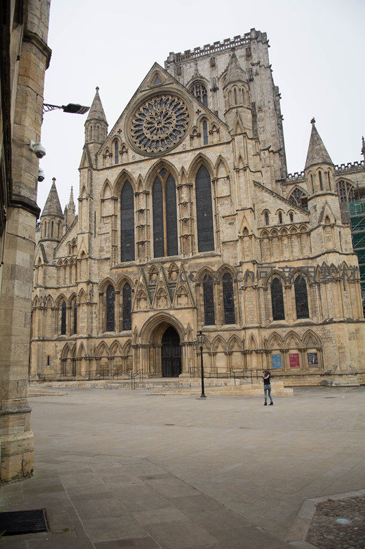 约克大教堂西立面全景,高耸双塔与中央巨大玫瑰窗构成经典哥特式构图,精细浮雕遍布门廊与飞扶壁,浅色石灰岩在阴天柔光下更显肃穆;广场上一人驻足凝望,凸显建筑磅礴尺度。