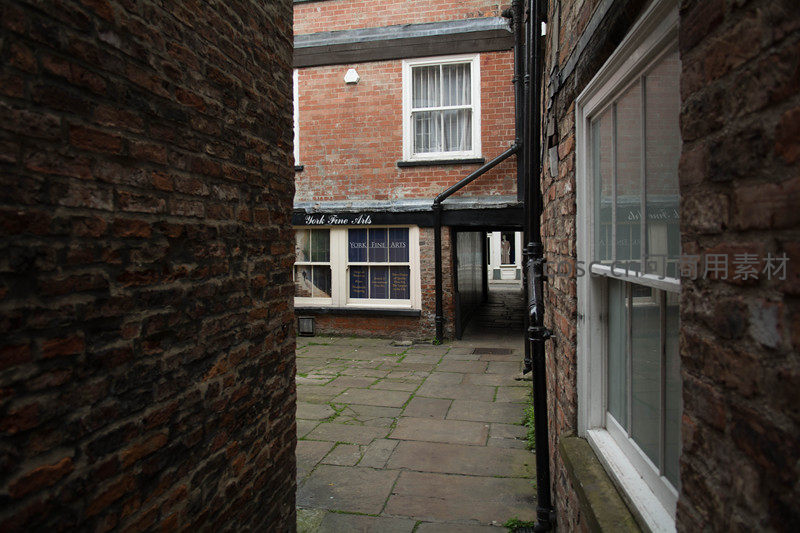 以两侧斑驳红砖墙为框景,聚焦‘York Fine Arts’画廊所在院落:白窗框、蓝字招牌与青苔石板地面相映成趣;管道与窗棂勾勒出生活痕迹,呈现约克老城中隐秘而雅致的艺术空间一角。
