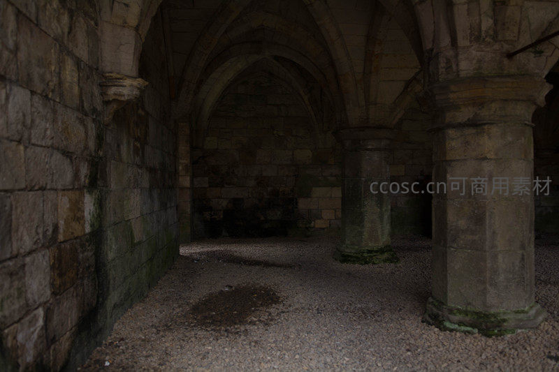 哥特式拱顶地下回廊,石柱森然,幽暗中透出历史沧桑感