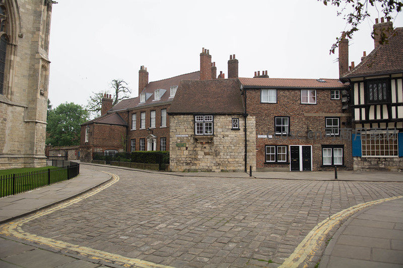 阴天下的约克老城街角,红砖与砂岩砌筑的传统房屋错落排列,屋顶烟囱林立;左侧可见约克大教堂部分尖塔,弯曲的鹅卵石路与黄线标示出宁静而厚重的历史氛围。