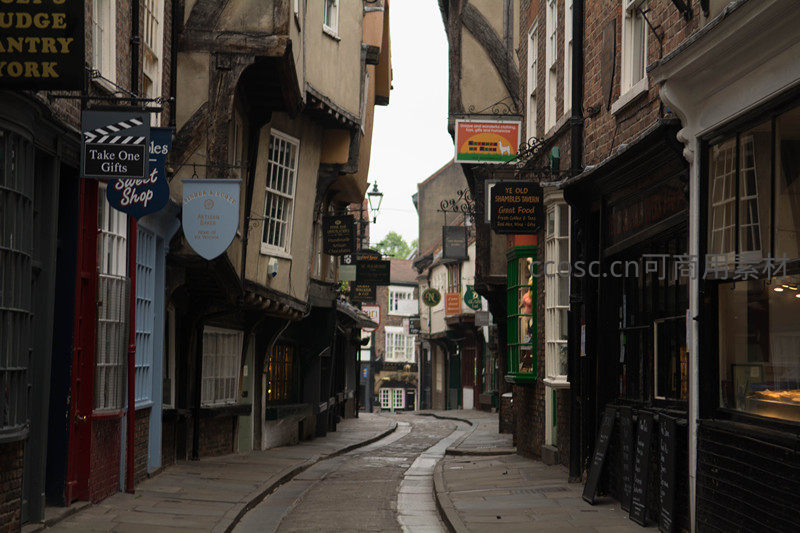 英国约克著名的肉铺街(The Shambles),狭窄弯曲的中世纪街道两旁是倾斜的木构架房屋,各色复古招牌悬于街巷上方,湿润石板路映着微光,充满浓郁历史气息与生活质感。