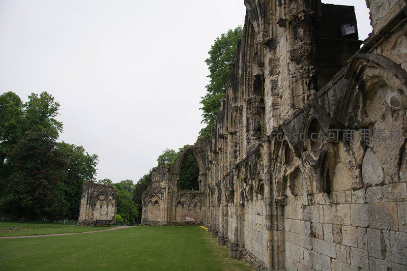 英国约克圣玛丽修道院残存的哥特式石墙与尖拱窗洞在阴天中静默矗立,青翠草坪延伸至断壁之间,高大乔木环绕,展现千年历史沧桑与自然共生的宁静画面。