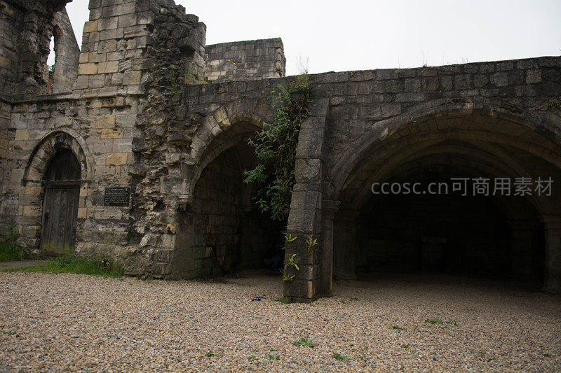 低机位仰拍修道院残存的三连拱券通道入口,内部幽暗深邃,墙体裂缝中生长出顽强绿植,碎石地面散落杂物,营造出神秘而肃穆的历史沉浸感。