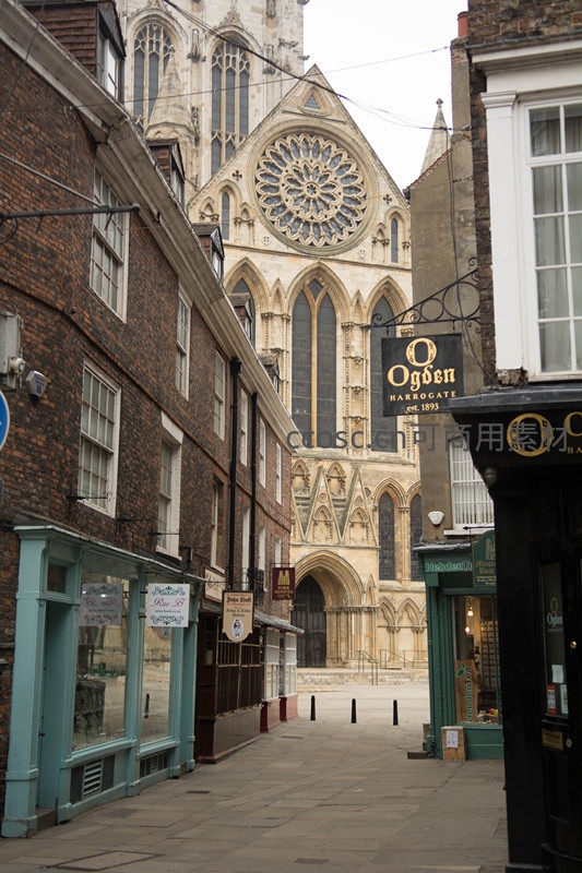 约克大教堂玫瑰窗与古街巷景致,砖石建筑映衬历史厚重感