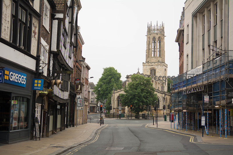 空旷的约克街巷通向宏伟的约克明斯特大教堂,哥特式尖塔高耸入云,两侧传统店铺与脚手架并存;绿树点缀其间,呈现历史与现代交织的城市肌理。