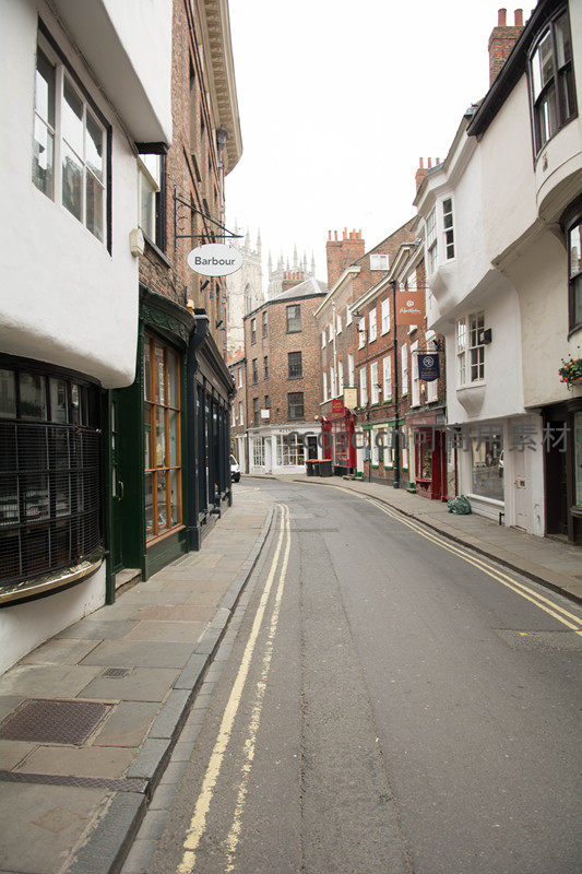 约克古城窄巷清晨静谧街景,白墙砖房与远处教堂尖顶相映成趣
