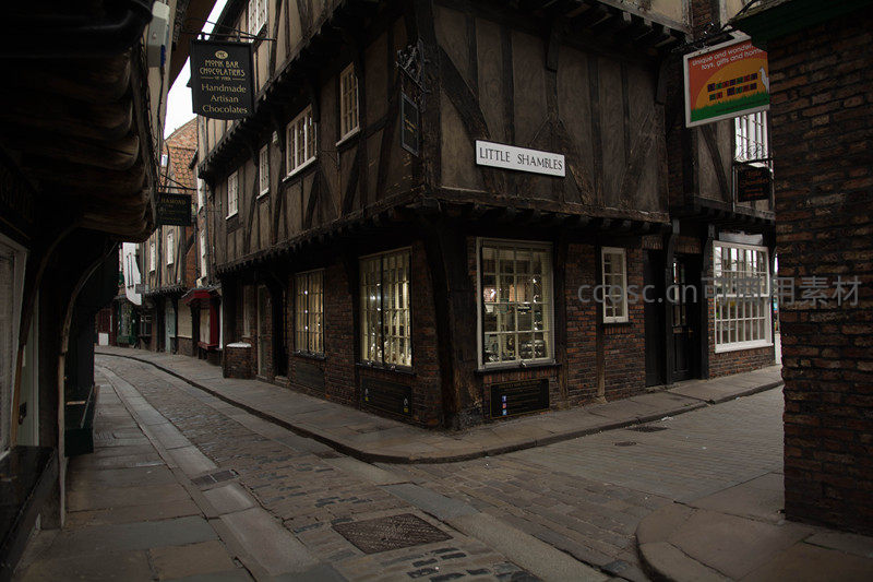 约克著名肉铺街(The Shambles)典型都铎时期木桁架建筑,深色橡木梁柱与砖墙交错,‘Little Shambles’招牌悬于转角,橱窗内灯光柔和,石板路蜿蜒向前,展现中世纪商业街原貌与生活气息。