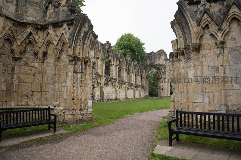 约克修道院遗址拱廊残垣,青草小径穿行其间,长椅静候访客