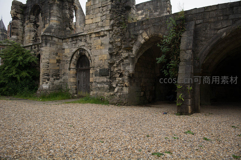 约克修道院遗址石拱门与青苔斑驳的古老墙体